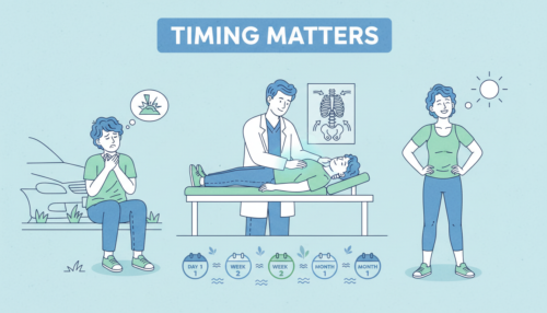 早めに受診して診断や状態の記録を残しておけば、その後に症状が強くなってきた場合でも、事故との因果関係を説明しやすくなります。痛みや違和感が軽いうちからケアを始められるため、慢性化を防ぐ意味でも、早期受診は重要だといえます。